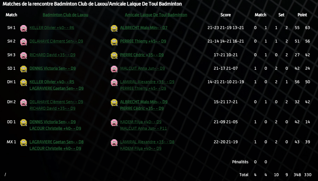 - Double hommes 2 : Défaite en 2 sets pour David et Clément malgré un match très serré au niveau du score.