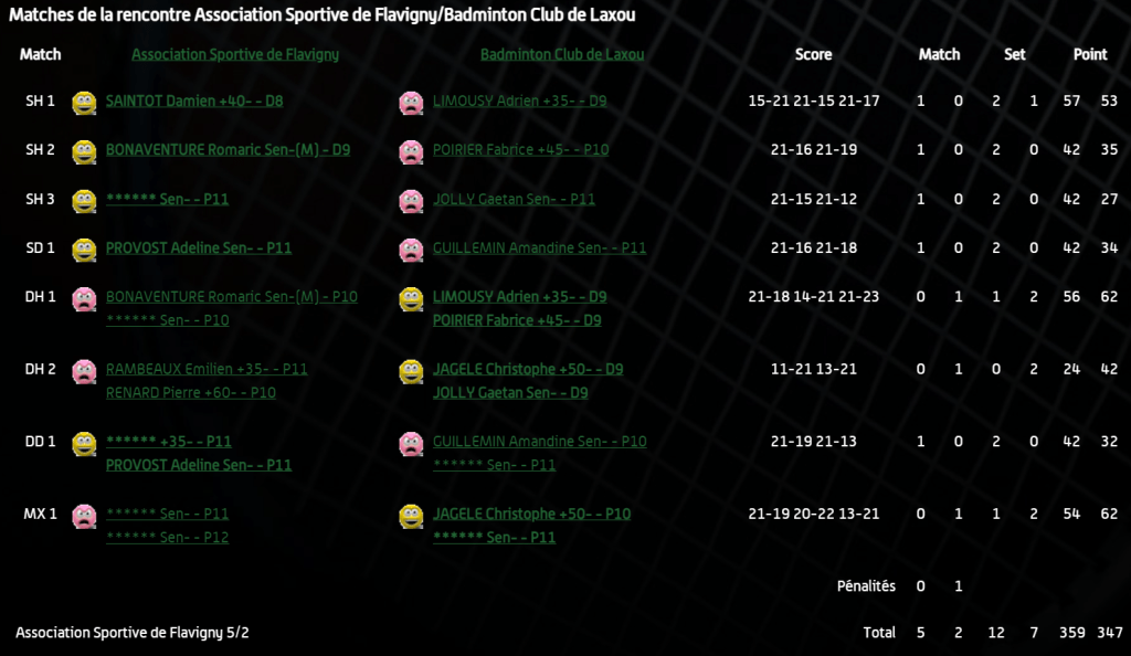 - Double hommes 1 : Victoire en 3 sets très serrés pour Fabrice et Adrien.