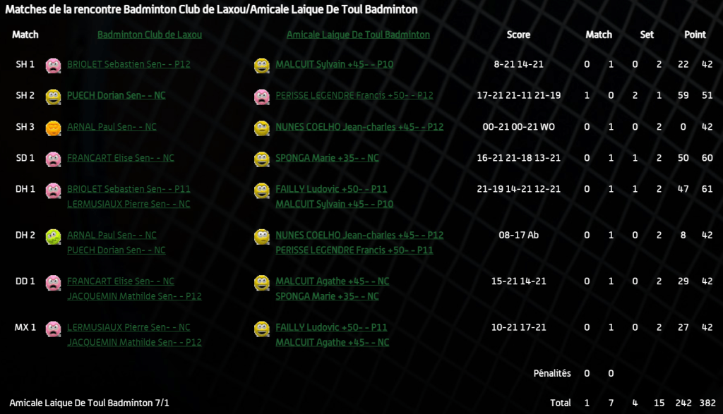 - Double dames 1 : Défaite en 2 sets accrochés pour Coralie et Loredane malgré un premier set très accroché.