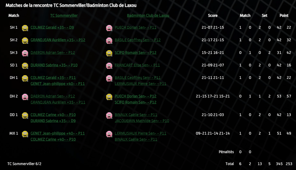 - Double hommes 1 : Défaite de Jean mi et Thierry en 3 sets.