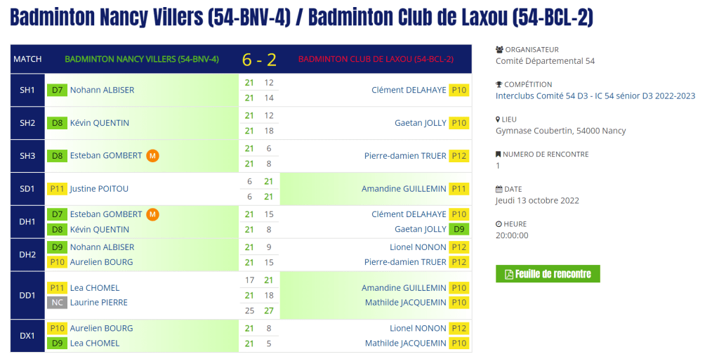 - Double hommes 1 : Défaite en 2 sets pour Gaëtan et Clément.