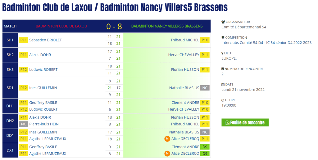 - Double mixte : Défaite en 2 sets pour Agathe et Geoffrey.