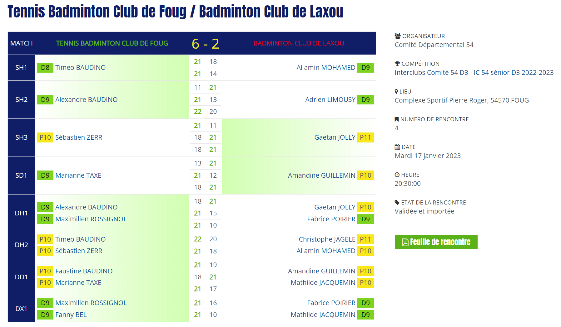 - Double hommes 1 : Défaite en 3 sets accrochés pour Fabrice et Gaëtan.