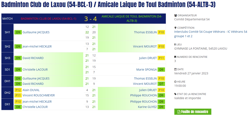 - Double hommes 1 : Victoire en 2 sets pour Guillaume et David.