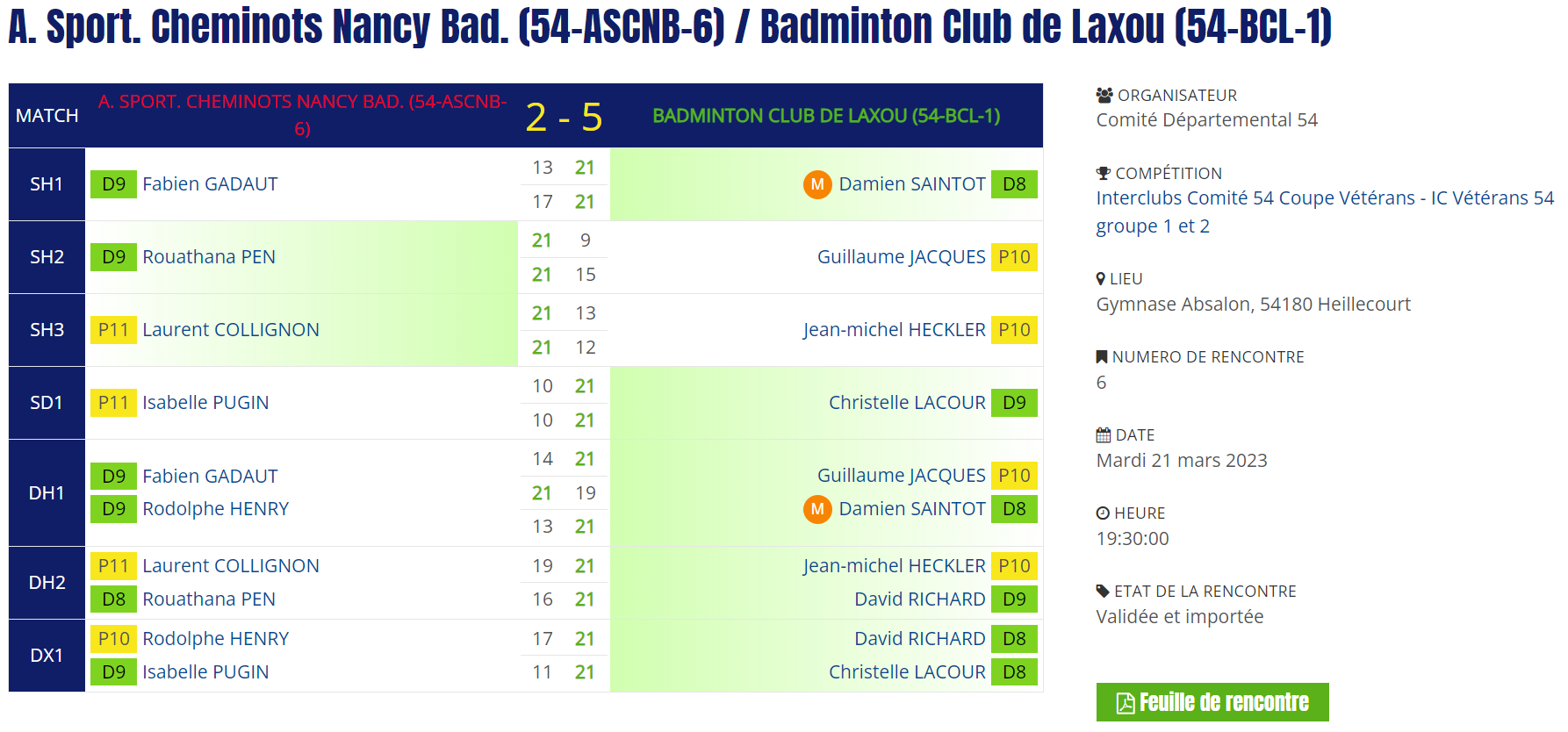 - Double hommes 1 : Victoire en 3 sets pour Guillaume et Damien.