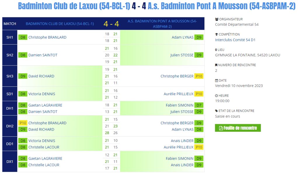 - Double hommes 1 : Défaite en 2 sets pour Damien et Gaëtan.