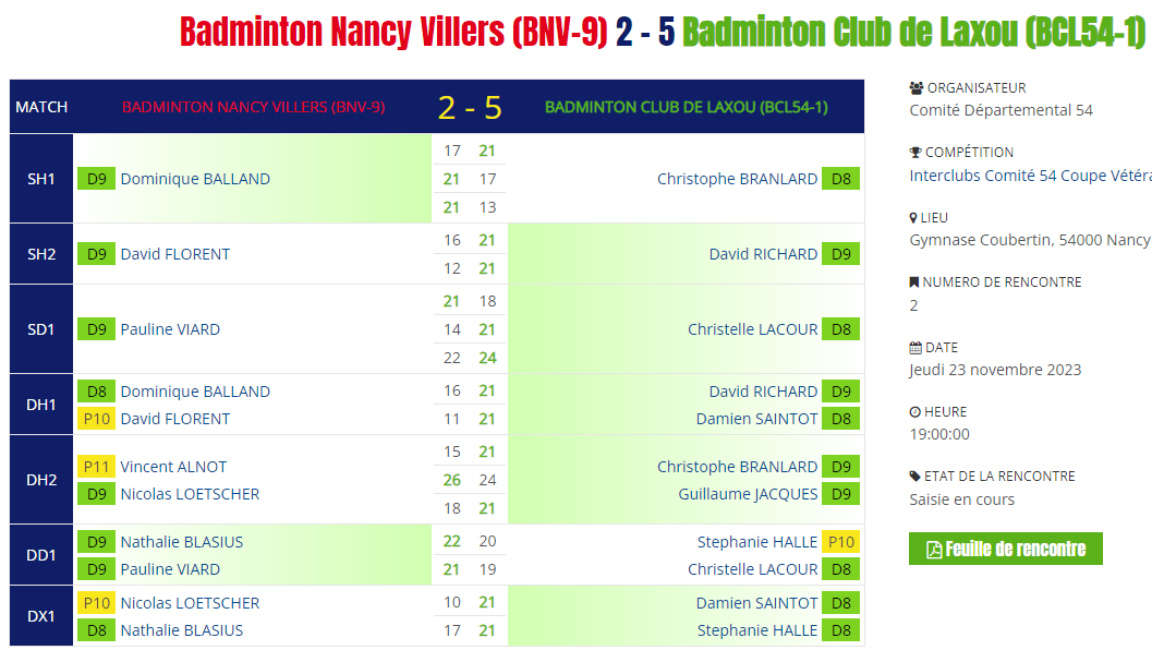 - Double hommes 2 : Victoire en 3 sets serrés pour Christophe et Guillaume.