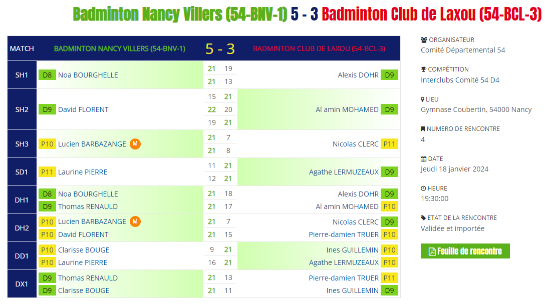 - Double hommes 2 : Défaite en 2 sets pour Pierre Damien et Nicolas.