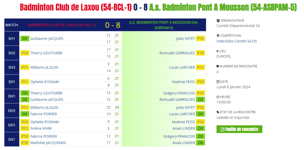 Quatrième journée d’interclubs pour l’équipe 4 du BCL à domicile face à Pont à Mousson :