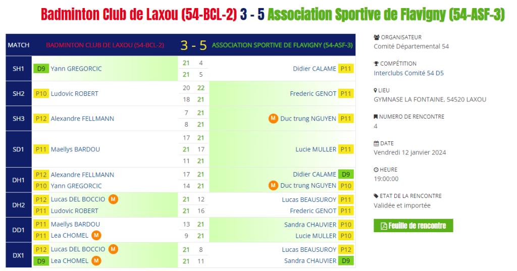 Quatrième journée d’interclubs pour l’équipe 5 du BCL à domicile face à Flavigny :