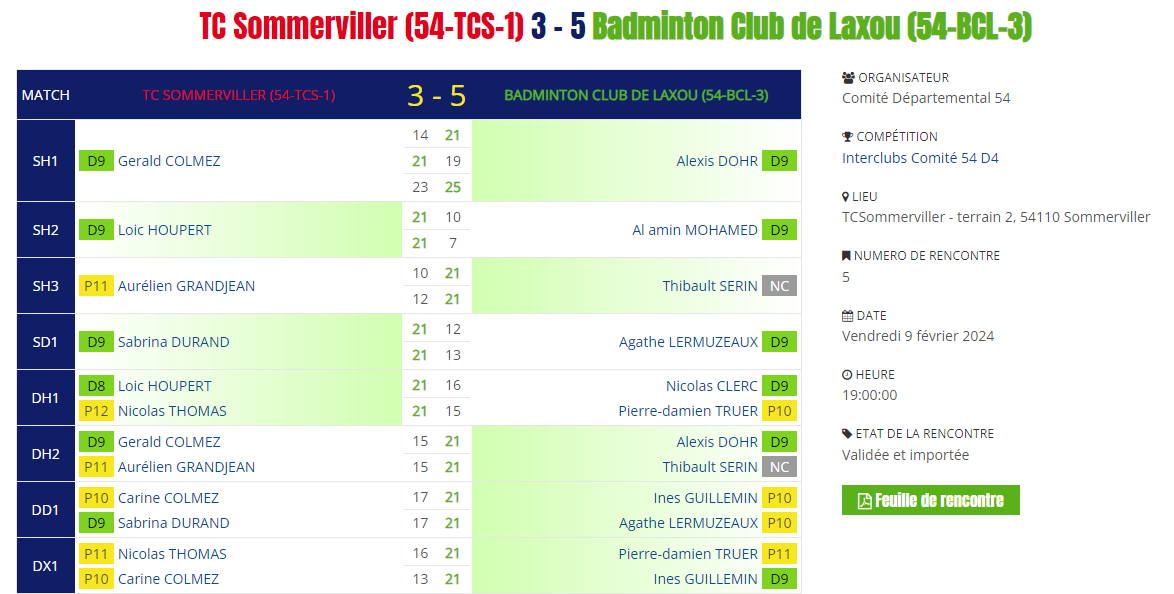 - Simple homme 1 : Victoire d’Alexis en 3 sets.
