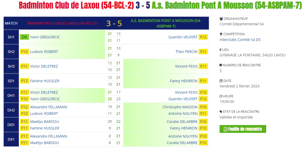 Cinquième journée d’interclubs pour l’équipe 5 du BCL à domicile face à Pont à Mousson :