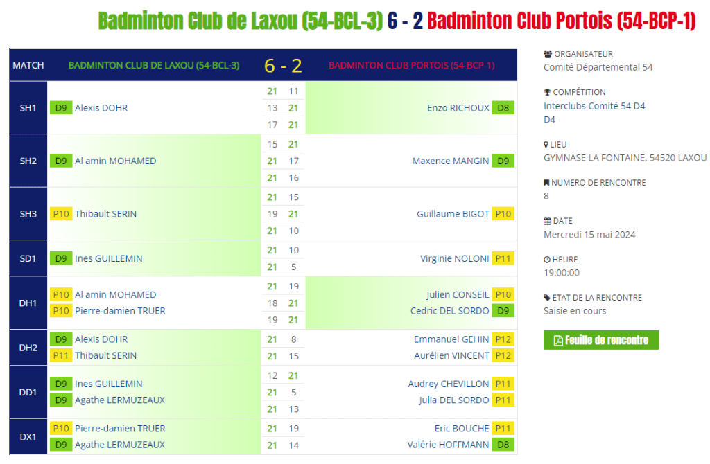 - Double hommes 1 : Défaite en 3 sets pour Amin et Pierre Damien.