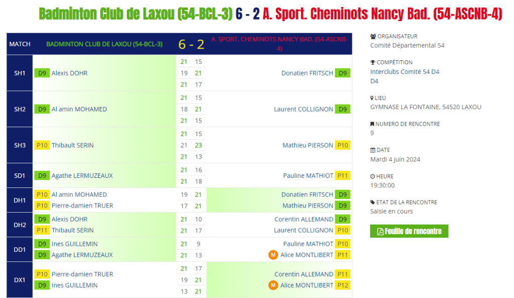 - Simple homme 1 : Victoire d’Alexis en 3 sets.