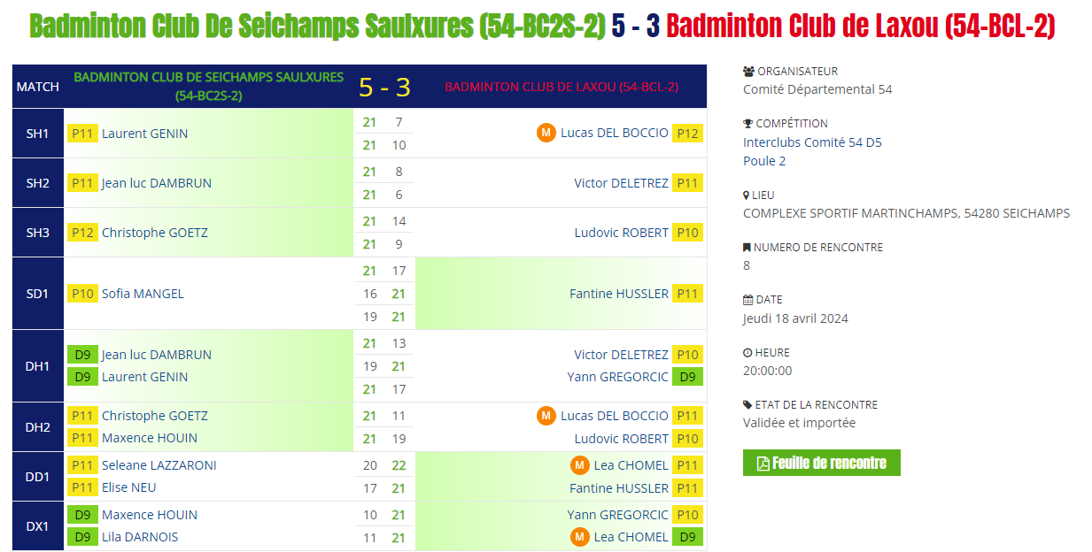 Huitième journée d’interclubs pour l’équipe 5 du BCL à l’extérieur face à Seichamps :