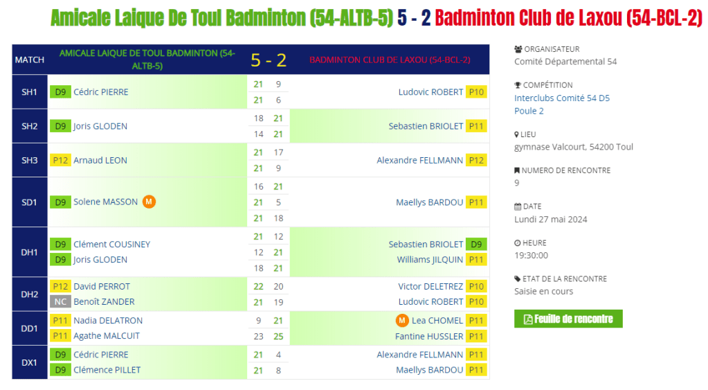 Neuvième et dernière journée d’interclubs pour l’équipe 5 du BCL à l’extérieur face à Toul :