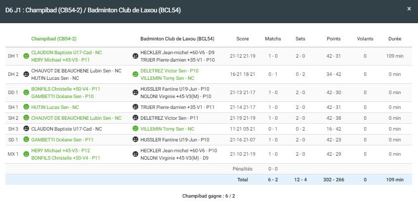 - Double homme 1 : Défaite en 2 sets pour Jean Michel et Pierre Damien