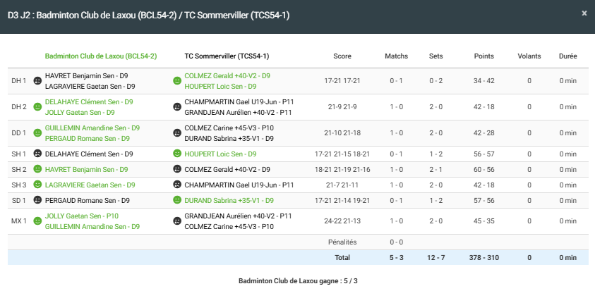 - Double homme 1 : Défaite en 2 sets pour Benjamin et Gaëtan L
