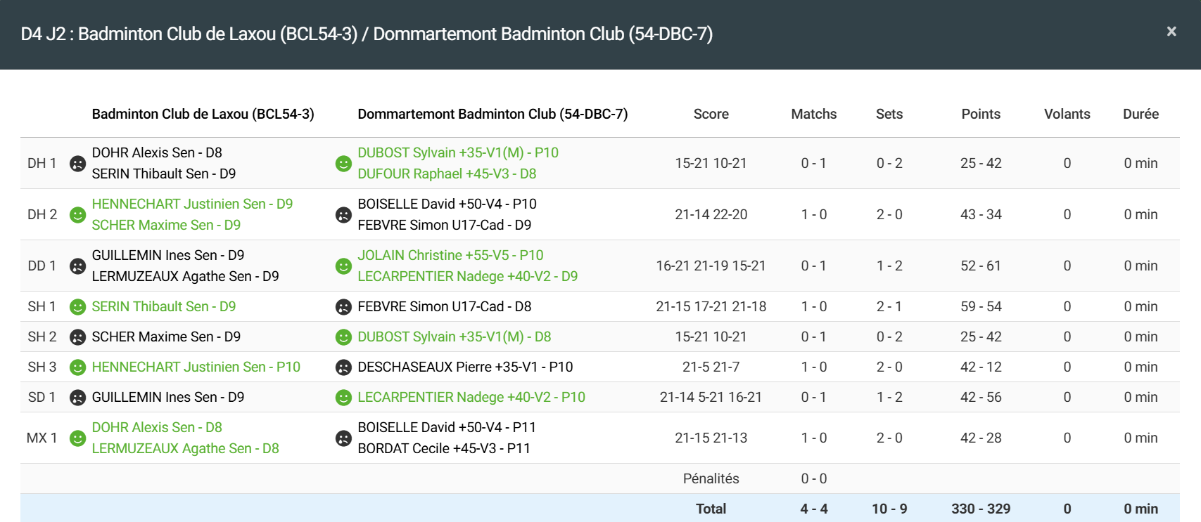 - Double homme 1 : Défaite en 2 sets pour Alexis et Thibault