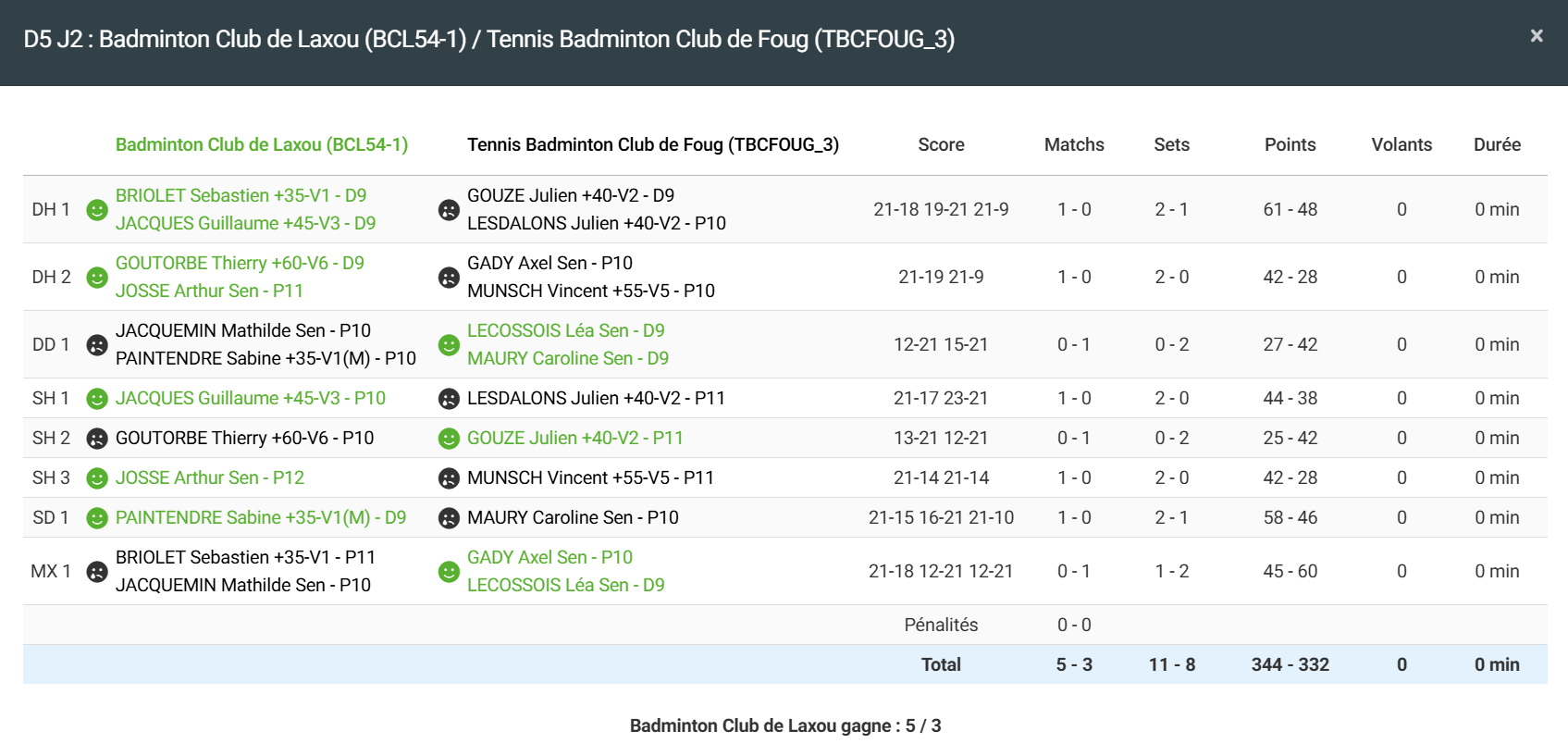 - Double homme 1 : Victoire en 3 sets pour Sébastien et Guillaume