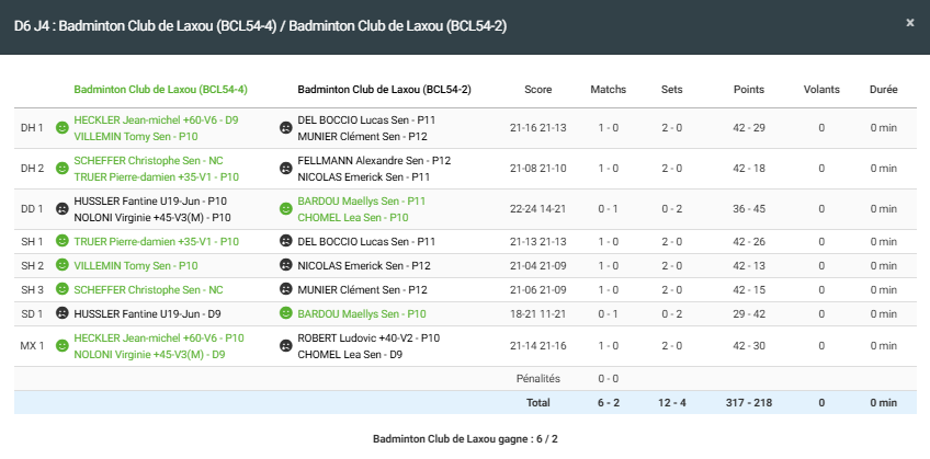 - Double homme 1 : Victoire pour Jean Michel et Tomy face à Lucas et Clément