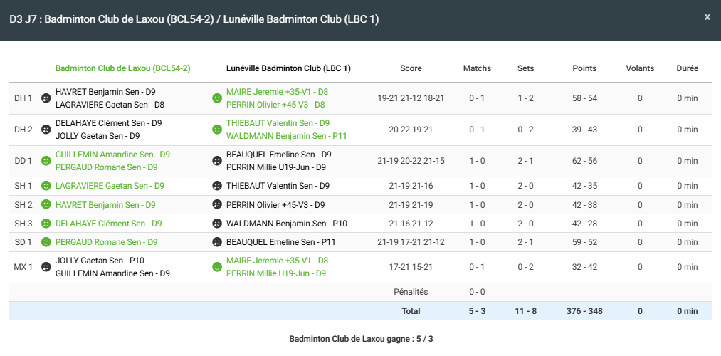 - Double homme 1 : Défaite en 3 sets pour Benjamin et Gaetan L