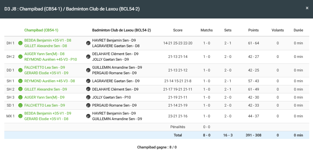 - Double homme 1 : Défaite en 3 sets pour Benjamin et Gaetan L