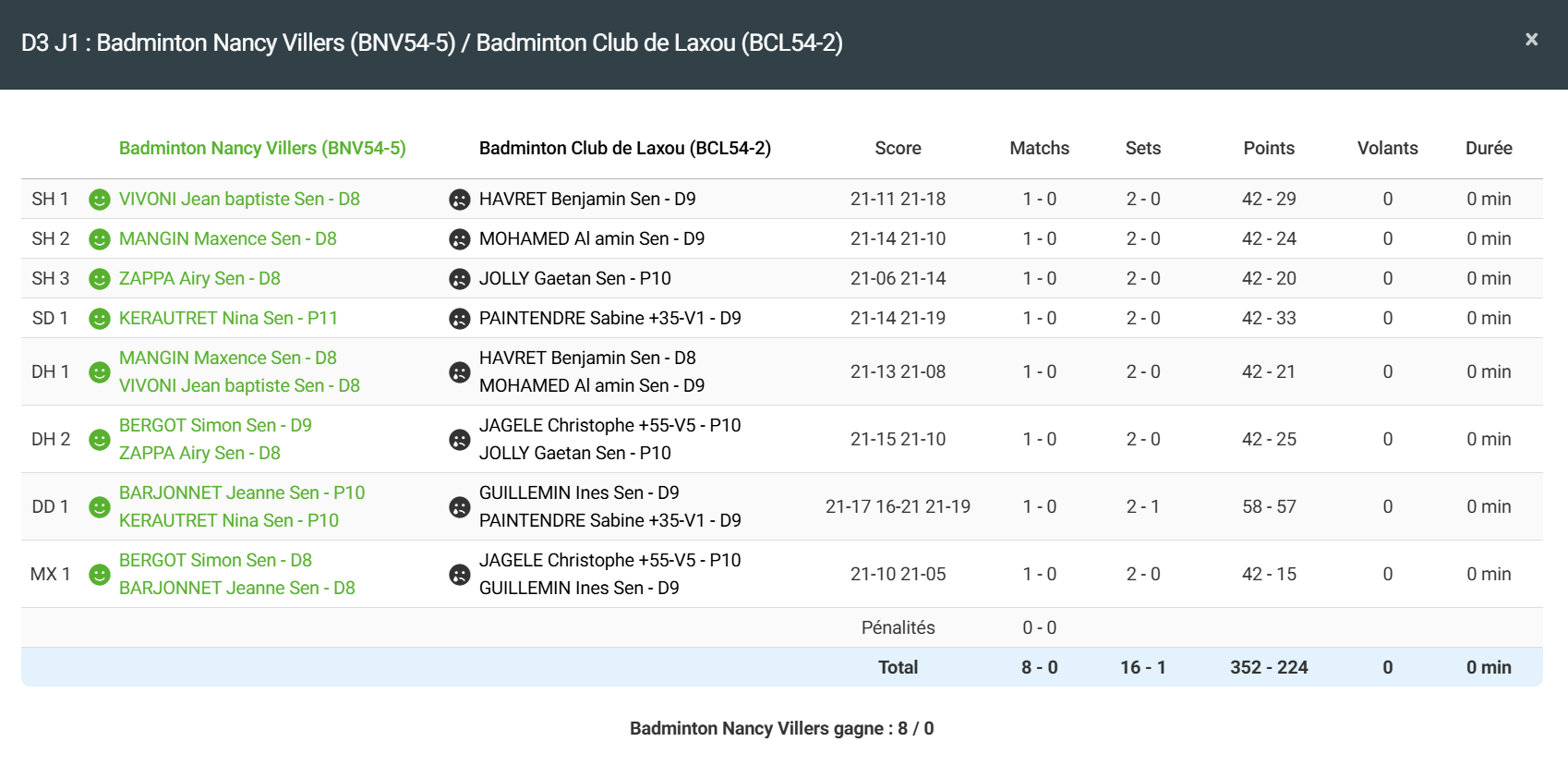 - Double homme 1 : Défaite en 2 sets pour Benjamin et Amin