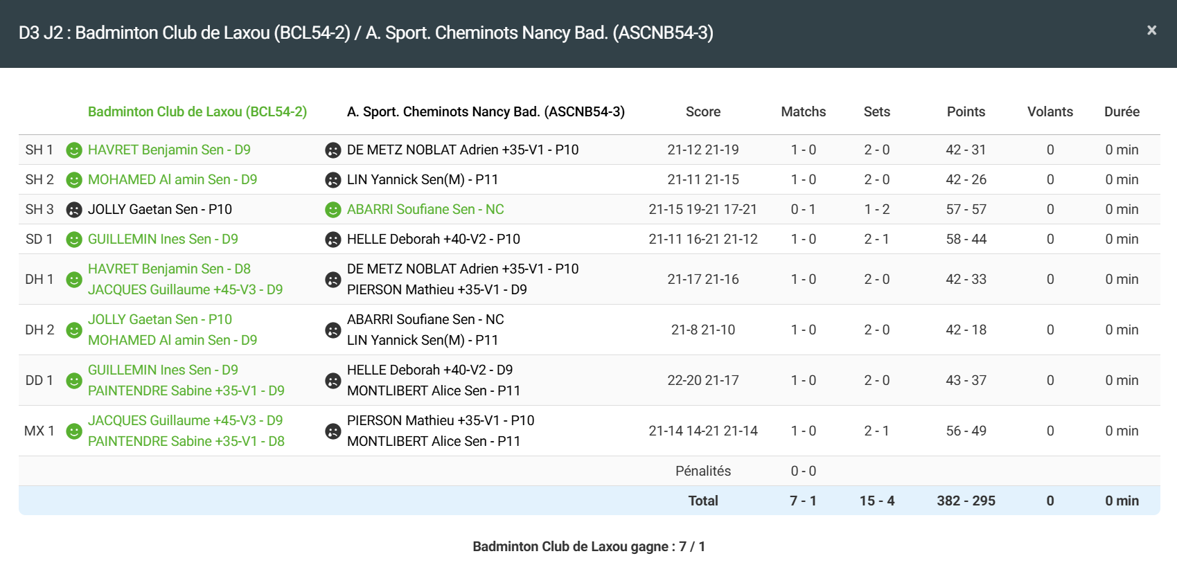 - Double homme 1 : Victoire en 2 sets pour Benjamin et Guillaume