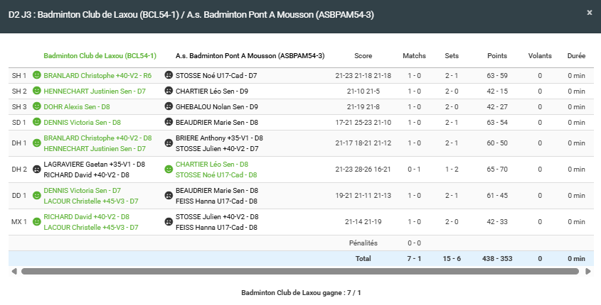 - Double homme 1 : Victoire en 3 sets pour Alexis et Justinien