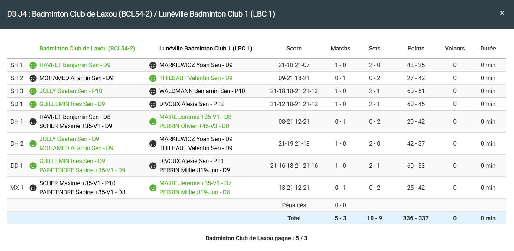 - Double homme 1 : Défaite en 2 sets pour Benjamin et Maxime