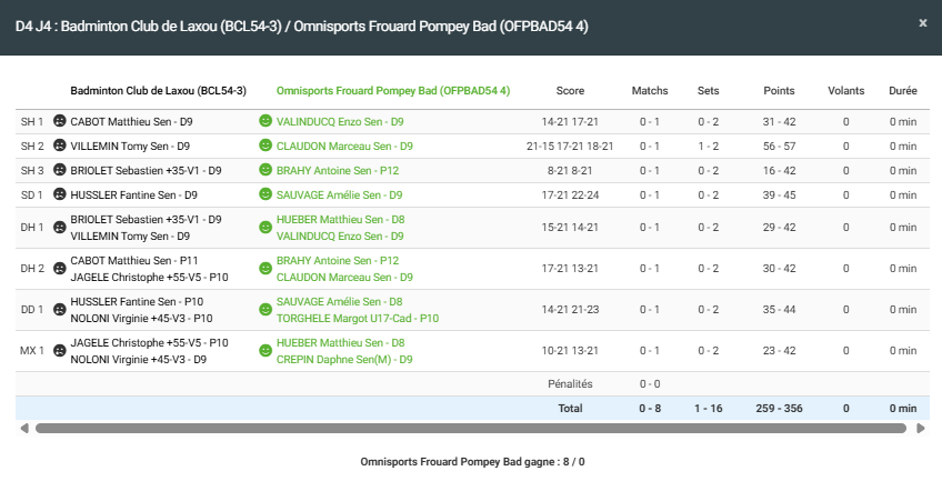 - Double homme 1 : Défaite en 2 sets pour Sebastien et Tomy