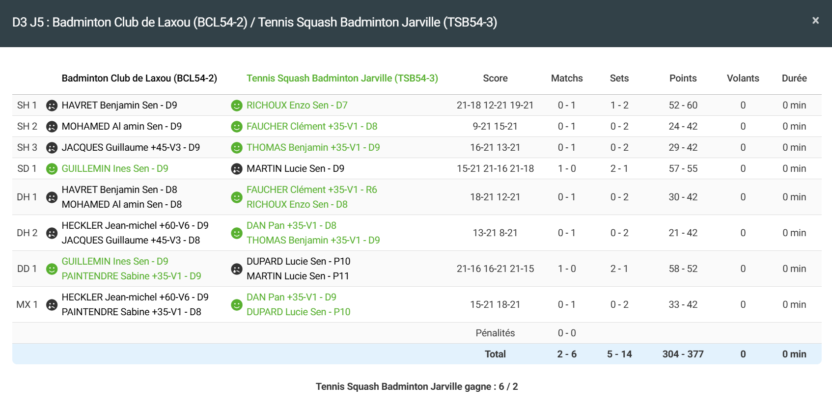 - Double homme 1 : Défaite en 2 sets pour Benjamin et Amin
