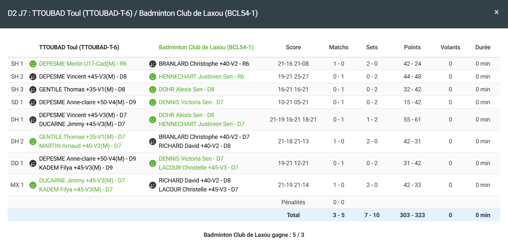 - Double homme 2 : Défaite en 2 sets pour David et Christophe